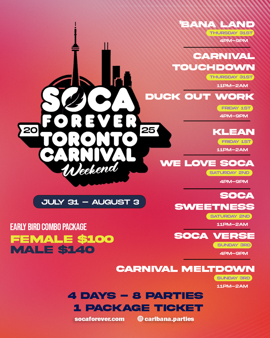 Start your Caribana weekend with a daytime shell-down like no other. Bana Land brings pure energy, sunshine, and nonstop Soca, Dancehall, and Afrobeats. It’s the first jump-up of the weekend—outside, loud, and full of vibes. Come ready to sweat, whine, and kick things off proper.